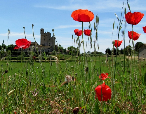 Tag: papaveri, rosso, castello, verde, fiori, cielo, erba, petali, prato, boccioli, campo, natura, azzurro, steli, edificio.