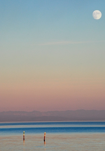 Tag: luna, mare, pali, tramonto, acqua, montagne, cielo, azzurro, alba, rosa.