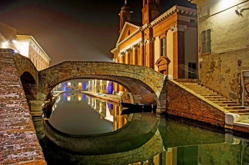 Tag: ponte, canale, riflesso, acqua, notte, notturno, scala, comacchio, riflessi, luci.