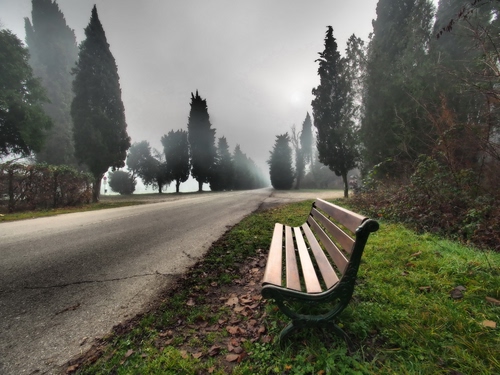 Foto molto bella, panchina in primo piano molto ben definita. Ottima l'esposizione e la scelta del punto di ripresa. Il taglio dell'inquadratura direi che è stato decisamente azzeccato. Il resto del viale e la nebbia sullo sfondo rendono questa foto viva e un po' malinconica. Osservandola attentamente, suscita varie sensazioni tra cui quella di immaginare di camminare lungo il viale di cipressi e chiedersi se fermarsi per qualche minuto a sedere sulla panchina per riposarsi. Anche se al primo sguardo le diagonali portano l'occhio a guardare verso il punto di fine viale, subito ci si rende conto che il soggetto principale è la panchina, con un'ottima messa a fuoco e una buona scelta dei terzi. Bello scatto, complimenti.