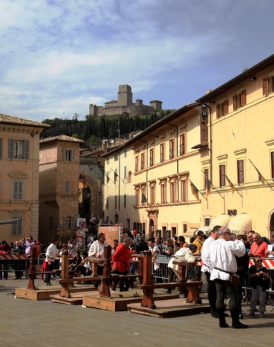 Assisi, all'ombra del castello i balestrieri ridanno vita al medioevo.