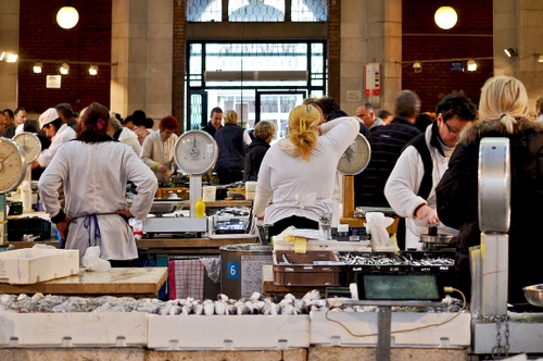 Tag: bilance, pescheria, pesce, porta, cassette, mercato, persone, bianco, luci, banchi, acquirenti, negozio, commesse, pesci, venditori, bilancia.