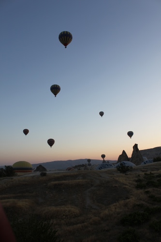 Mongolfiere in fase ascensionale al mattino presto, in Cappadocia.