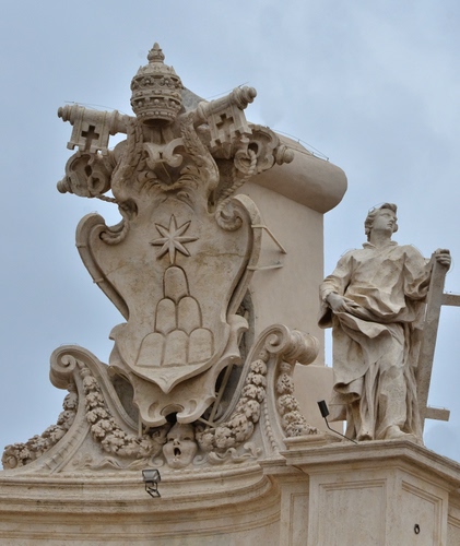Tag: statua, stemma, chiavi, marmo, cielo, tiara, stella, vaticano, scultura, bianco.