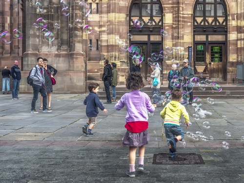bello scatto "sur le vif" (dal vivo) con i bambini che corrono verso i due anziani che si intravedono dietro fermi.Se posso dire: avrei tagliato a sx quell'altra copia per accentuare il movimento, la corsa verso la copia anziana ![]() |