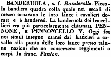 Banderuola - s. f. Banderolle. Piccola bandiera quadra colla quale nei secoli di mezzo ornavano le loro lance i cavalieri dorati e i banderesi. La banderuola dei baccellieri era più particolarmente chiamata PENNONE, e PENNONCELLO V. Oggi fra noi simili insegne usansi dai Lancieri a cavallo alla punta delle loro lance presso talune nazioni che ne conservano reggimenti o corpi. In franc. Fanion. [immagine]