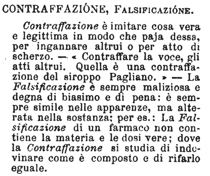 Contraffazione, Falsificazione - Contraffazione è imitare cosa vera e legittima in modo che paja dessa, per ingannare altrui o per atto di scherzo. - «Contraffare la voce, gli atti altrui. Quella è una contraffazione del siroppo Pagliano.» - La Falsificazione è sempre maliziosa e degna di biasimo e di pena: è sempre simile nelle apparenze, ma alterata nella sostanza; per es.: La Falsificazione di un farmaco non contiene la materia e le dosi vere; dove la Contraffazione si studia di indovinare come è composto e di rifarlo eguale. [immagine]