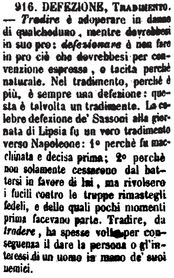| Defezione, Tradimento - Tradire è adoperare in danno di qualcheduno, mentre dovrebbesi in suo pro: defezionare è non fare in pro ciò che dovrebbesi per convenzione espressa, o tacita perchè naturale. Nel tradimento, perchè è più, è sempre una defezione: questa è talvolta un tradimento. La celebre defezione de' Sassoni alla giornata di Lipsia fu un vero tradimento verso Napoleone: 1° perchè fu macchinata e decisa prima; 2° perchè non solamente cessarono dal battersi in favore di lui, ma rivolsero i fucili contro le truppe rimastegli fedeli, e delle quali pochi momenti prima facevano parte. Tradire, da tradere, ha spesse volte per conseguenza il dare la persona o gl'interessi di un uomo in mano de' suoi nemici. [immagine] |