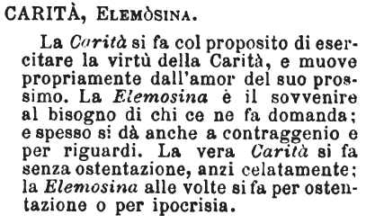 Carità, Elemosina - L'elemosina è più minuta, perciò si può fare più di sovente; la carità è atto più essenziale, più generoso, più nobile; molti fanno elemosina, pochi sanno fare la carità: l'elemosina consiste sempre in danaro o roba; la carità può farsi talora con un buon consiglio, una buona parola, una raccomandazione e simili. [immagine]