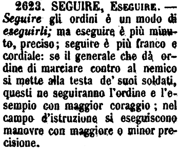 Seguire, Eseguire - Seguire gli ordini è un modo di eseguirli; ma eseguire è più minuto, preciso; seguire è più franco e cordiale: se il generale che dà ordine di marciare contro al nemico si mette alla testa de' suoi soldati, questi ne seguiranno l'ordine e l'esempio con maggior coraggio; nel campo d'istruzione si eseguiscono manovre con maggiore o minor precisione. [immagine]