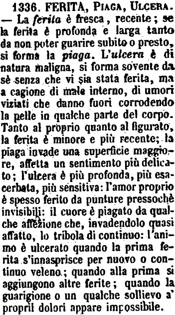 | Ferita, Piaga, Ulcera - La ferita è fresca, recente; se la ferita è profonda e larga tanto da non poter guarire subito o presto, si forma la piaga. L'ulcera è di natura maligna, si forma sovente da sè senza che vi sia stata ferita, ma a cagione di male interno, di umori viziati che danno fuori corrodendo la pelle in qualche parte del corpo. Tanto al proprio quanto al figurato, la ferita è minore e più recente; la piaga invade una superficie maggiore, affetta un sentimento più delicato; l'ulcera è più profonda, più esacerbata, più sensitiva: l'amor proprio è spesso ferito da punture pressochè invisibili: il cuore è piagato da qualche affezione che, invadendolo quasi affatto, lo tribola di continuo: l'animo è ulcerato quando la prima ferita s'innasprisce per nuovo o continuo veleno; quando alla prima si aggiungono altre ferite; quando la guarigione o un qualche sollievo a' proprii dolori appare impossibile. [immagine] |