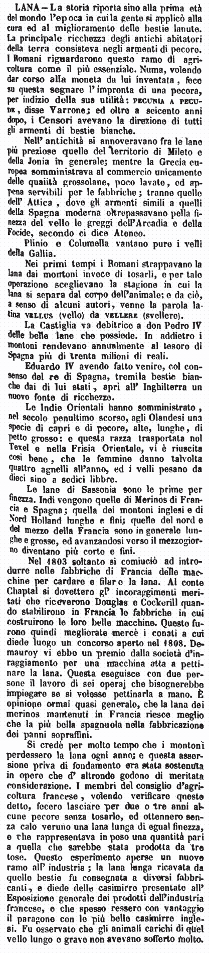 | Lana - La storia riporta sino alla prima età del mondo l'epoca in cui la gente si applicò alla cura ed al miglioramento delle bestie lanute. La principale ricchezza degli antichi abitatori della terra consisteva negli armenti di pecore. I Romani riguardarono questo ramo di agricoltura come il più essenziale. Numa, volendo dar corso alla moneta da lui inventata, fece su questa segnare l'impronta di una pecora, per indizio della sua utilità: pecunia a pecude, disse Varrone; ed oltre a seicento anni dopo, i Censori avevano la direzione di tutti gli armenti di bestie bianche.