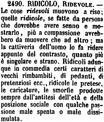 Ridicolo, Ridevole, Ridicoloso, Ridicolezza, Ridicolaggine - Ridicolo è colui o quella cosa che per la sua piacevolezza, e spesso per la sua stranezza, provoca il riso; che se è per sola stranezza, alcuni dicono Ridicoloso, ma con affettazione. - Ridevole, parola della lingua scelta, accenna, più che altro, a dispregio, e vale quasi Degno di esser deriso. - Ridicolezza è la qualità astratta di persona o cosa ridicola. - Ridicolaggine, è l'atto o il parlare della persona ridicola, ma spesso si piglia anche per la qualità astratta con idea di dispregio. [immagine]