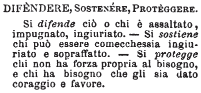 Difendere, Sostenere, Proteggere - Si difende ciò o chi è assaltato, impugnato, ingiuriato. - Si sostiene chi può essere comecchessia ingiuriato e sopraffatto. - Si protegge chi non ha forza propria al bisogno, e chi ha bisogno che gli sia dato coraggio e favore. [immagine]