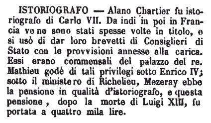Istoriografo - Alano Chartier fu istoriografo di Carlo VII. Da indi in poi in Francia ve ne sono stati spesse volte in titolo, e si usò di dar loro brevetti di Consiglieri di Stato con le provvisioni annesse alla carica. Essi erano commensali del palazzo del re. Mathieu godè di tali privilegi sotto Enrico IV; sotto il ministero di Richelieu, Mezeray ebbe la pensione in qualità d'istoriografo, e questa pensione, dopo la morte di Luigi XIII, fu portata a quattro mila lire. [immagine]